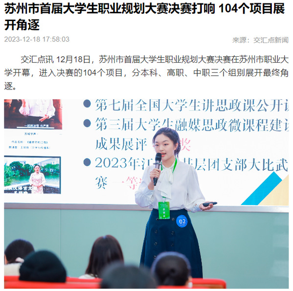 12月18日,苏州市首届大学生职业规划大赛决赛在苏州市职业大学开幕,进入决赛的104个项目,分本科、高职、中职三个组别展开最终角逐。