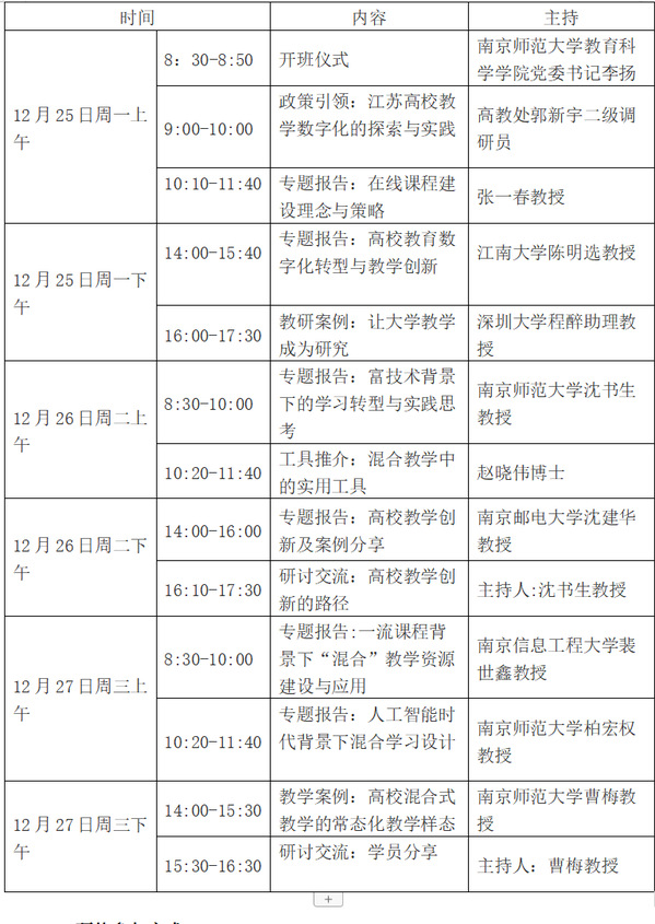 为促进信息技术与教育教学深度融合,推进在线课程建设,深化混合式课堂教学改革,切实提升课堂教学效果,提高教学质量,江苏省教育厅定于2023年12月25-27日举办本科院校“在线教学平台与资源建设”专题研修活动。现组织我校教师参加在线观摩,具体安排如下: