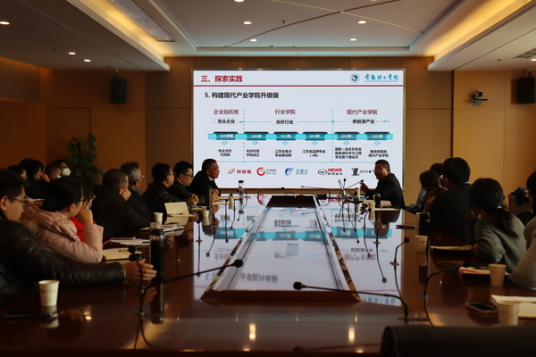 雎胜院长首先对钱斌教授的来访表示热烈的欢迎。随后,钱斌教授以产教融合开篇,向学院教师介绍了现代产业学院的建设背景、建设理念,并着重介绍了现代产业学院的探索与实践和建设标准。