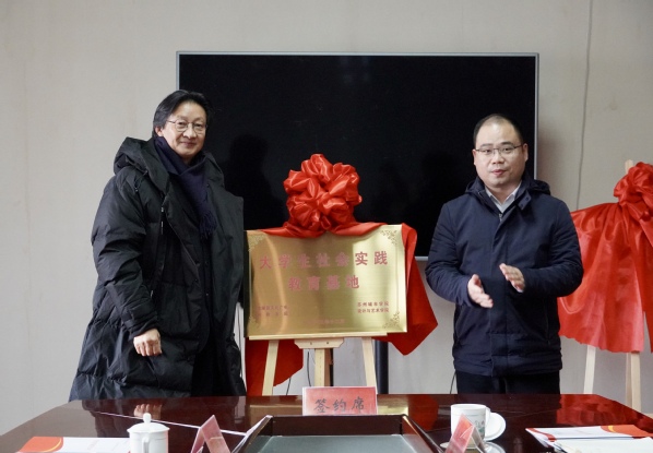 设计与艺术学院院长姜竹松与金湖县人民政府副县长张云辉为“教育实践基地”揭牌,设计与艺术学院党委副书记丁良超与共青团金湖县委书记朱染晅为“大学生社会实践基地”揭牌。