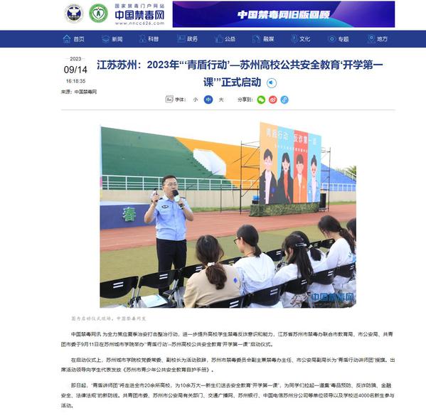 为全力策应夏季治安打击整治行动,进一步提升高校学生禁毒反诈意识和能力,江苏省苏州市禁毒办联合市教育局、市公安局、共青团市委于9月11日在苏州城市学院举办“‘青盾行动’--苏州高校公共安全教育‘开学第一课’”启动仪式。