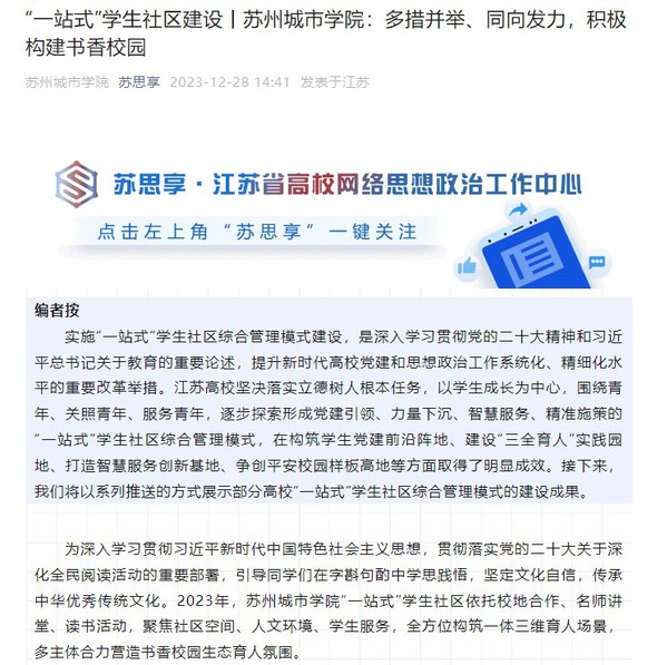 为深入学习贯彻习近平新时代中国特色社会主义思想,贯彻落实党的二十大关于深化全民阅读活动的重要部署,引导同学们在字斟句酌中学思践悟,坚定文化自信,传承中华优秀传统文化。2023年,苏州城市学院“一站式”学生社区依托校地合作、名师讲堂、读书活动,聚焦社区空间、人文环境、学生服务,全方位构筑一体三维育人场景,多主体合力营造书香校园生态育人氛围。