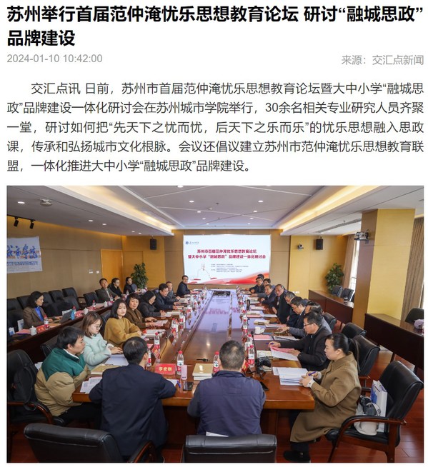 日前,苏州市首届范仲淹忧乐思想教育论坛暨大中小学“融城思政”品牌建设一体化研讨会在苏州城市学院举行,30余名相关专业研究人员齐聚一堂,研讨如何把“先天下之忧而忧,后天下之乐而乐”的忧乐思想融入思政课,传承和弘扬城市文化根脉。会议还倡议建立苏州市范仲淹忧乐思想教育联盟,一体化推进大中小学“融城思政”品牌建设。