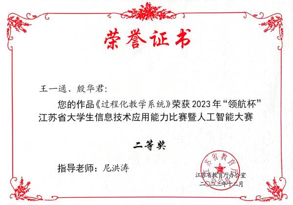 近日,江苏省教育厅下发《关于公布2023年“领航杯”江苏省大学生信息技术应用能力比赛暨人工智能大赛获奖结果的通知》。计算科学与人工智能学院王一通、殷华君两位同学在尼洪涛老师的指导下获得二等奖的优异成绩。
