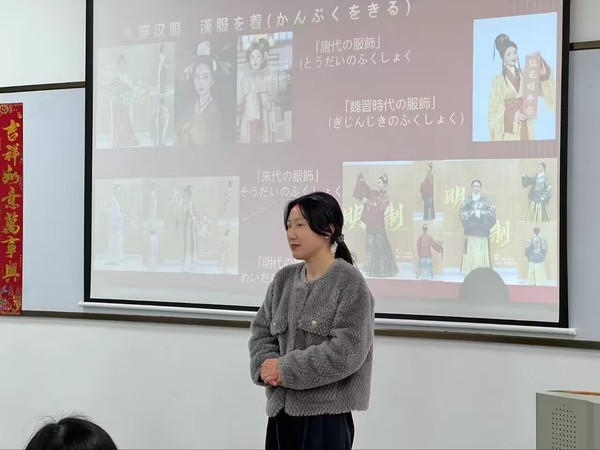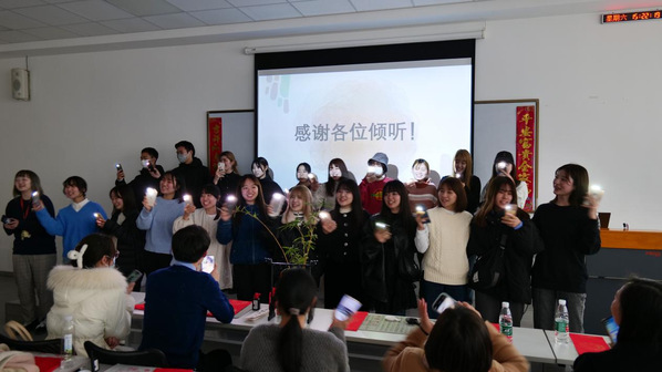 在交流分享环节,中日学生代表分别上台介绍各自的学校和城市。分享结束后日本宫崎公立大学短期研修团的同学们为大家带来了一首《哆啦A梦》的主题曲《ドラえもんのうた》。