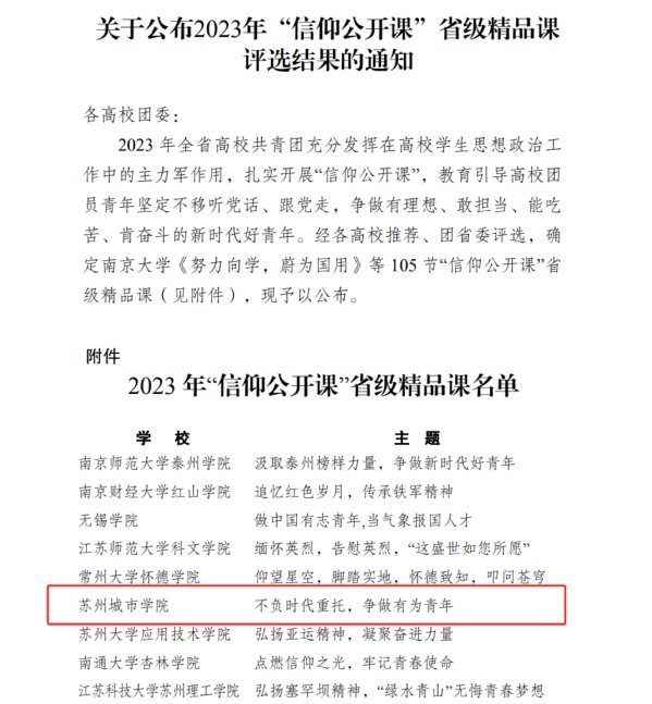 近日,共青团江苏省委公布2023年“信仰公开课”省级精品课评选结果,经各高校推荐、团省委评选,共确定105节“信仰公开课”省级精品课。我校城市文化与传播学院主办的《不负时代重托,争做有为青年》成功入选。