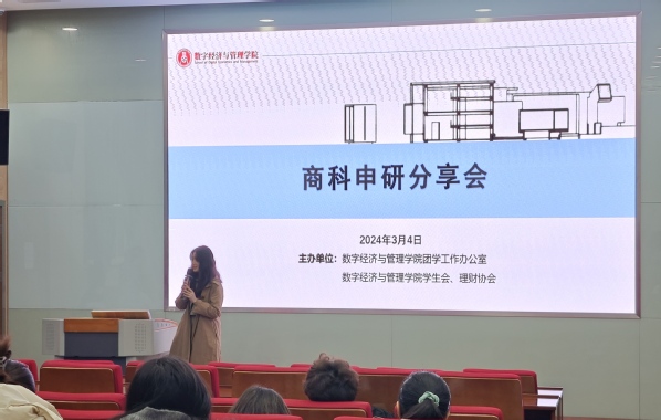 为增进同学们对海外申硕流程的了解,获取境外留学申请的相关信息,3月4日下午,数字经济与管理学院团学工作办公室、学生会联合理财协会邀请专业老师禹老师在教学楼3-101开展以“换个赛道,依然上岸”为主题的商科申研分享会。本次分享会由秦畅老师主持。