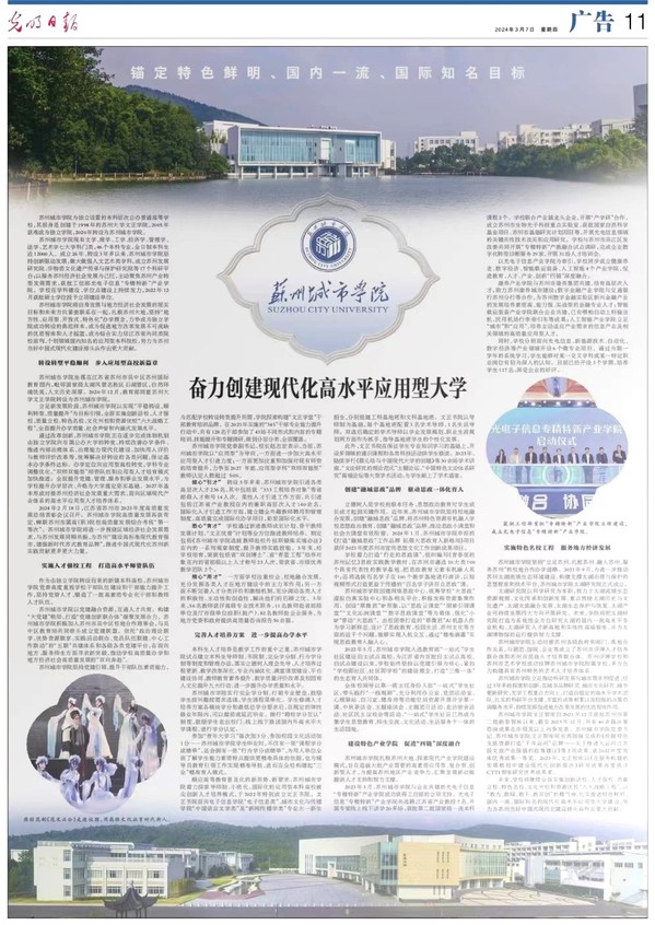 3月7日,《光明日报》专版以《锚定特色鲜明、国内一流、国际知名目标 苏州城市学院:奋力创建现代化高水平应用型大学》为题,报道我校高质量办学成效。