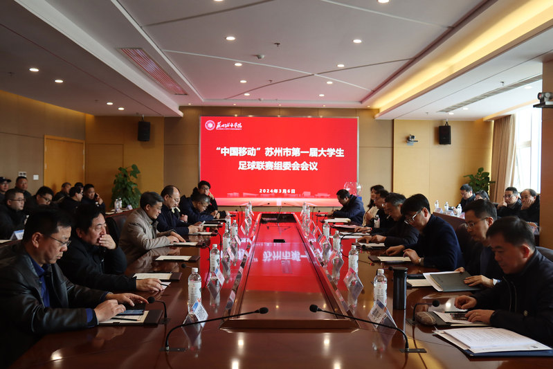 3月6日下午,“中国移动”苏州市第一届大学生足球联赛组委会会议在苏州城市学院召开。市政府副秘书长、市足协主席谢飞,市体育局副局长吴卫中,市教育局副局长项春雷,苏州团市委副书记蒋妍和相关单位负责人出席会议。会议由吴卫中主持。