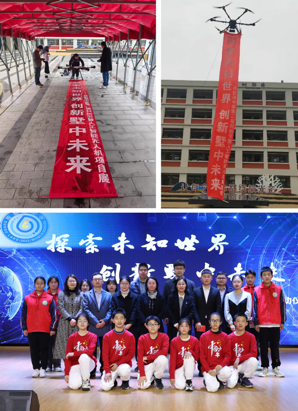 在开幕式上,我院尼洪涛师生团队为开幕式献上了大型无人机展示,由师生共同操作使用翼展2米的无人机将条幅拉起,飘扬在独墅湖中学教学楼的正前方,激发了中学生们的强烈兴趣,标志着无人机项目在独墅湖中学正式启动。