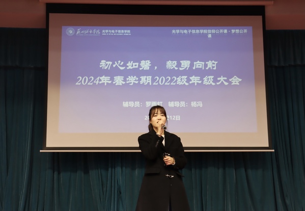为了激励同学们在新学期充满活力、踔厉奋发、笃行不怠,3月12日晚,光学与电子信息学院在学术报告厅召开2022级年级大会暨“初心如磐,毅勇向前”梦想公开课。21测控李雨婷、21电子张光赫、21能源材料孙晨昕进行分享。年级辅导员罗雨虹、杨冯,以及学院2022级全体学生参加会议,大会由杨冯主持。