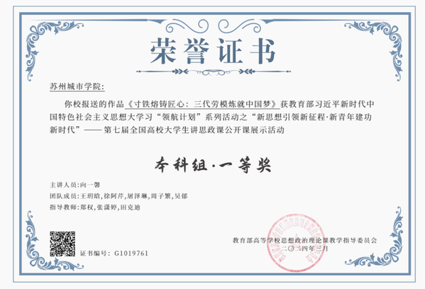 近日,由教育部高校思想政治理论课教学指导委员会主办、南开大学马克思主义学院承办的“新思想引领新征程·新青年建功新时代”——第七届全国高校大学生讲思政课公开课展示活动评审结果公布,由我校城市文化与传播学院向一馨、王玥晗、徐阿芹、屠泽琳、吴郁,城市治理与公共事务学院周子繁等6名同学作为团队成员的作品《寸铁熔铸匠心:三代劳模炼就中国梦》荣获全国本科组一等奖。