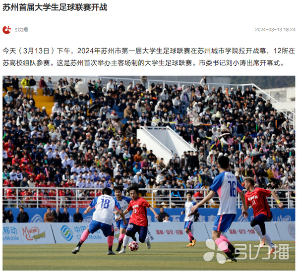 今天(3月13日)下午,2024年苏州市第一届大学生足球联赛在苏州城市学院拉开战幕,12所在苏高校组队参赛。这是苏州首次举办主客场制的大学生足球联赛。市委书记刘小涛出席开幕式。