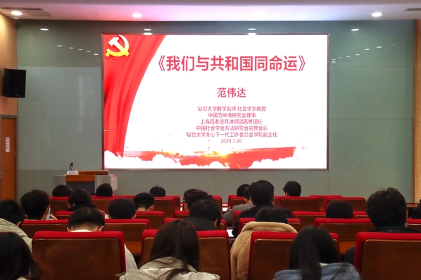 3月20日下午,我校“文正大讲坛”第十讲在3号教学楼101教室举行,复旦大学教学名师、社会学系教授范伟达应邀做客“文正大讲坛”,现场作题为《我们与共和国同命运》主题讲座,我校党委常委、党委宣传部部长仲宏与近两百名学生共同聆听了本次讲坛。讲座由党委宣传部副部长徐汝华主持。
