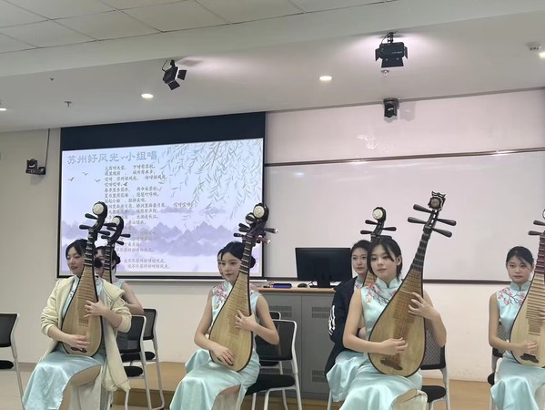现场教学环节更是让人眼前一亮。同学们纷纷跟随苏州评弹学校的学生学习苏州方言,尝试弹奏评弹乐器。在这过程中,他们不仅学会了弹奏技巧,更在音乐的熏陶中得到心灵的疗愈。仿佛那琴音中蕴含着某种神秘的力量,能够洗涤心灵的尘埃,让人重获新生。紧接着,评弹学校班长陈一诺带领同学们学唱《枫桥夜泊》。他们的表演仿佛已经成为了那江南水乡中的一道亮丽风景线,用音乐诠释着生活的美好与和谐。