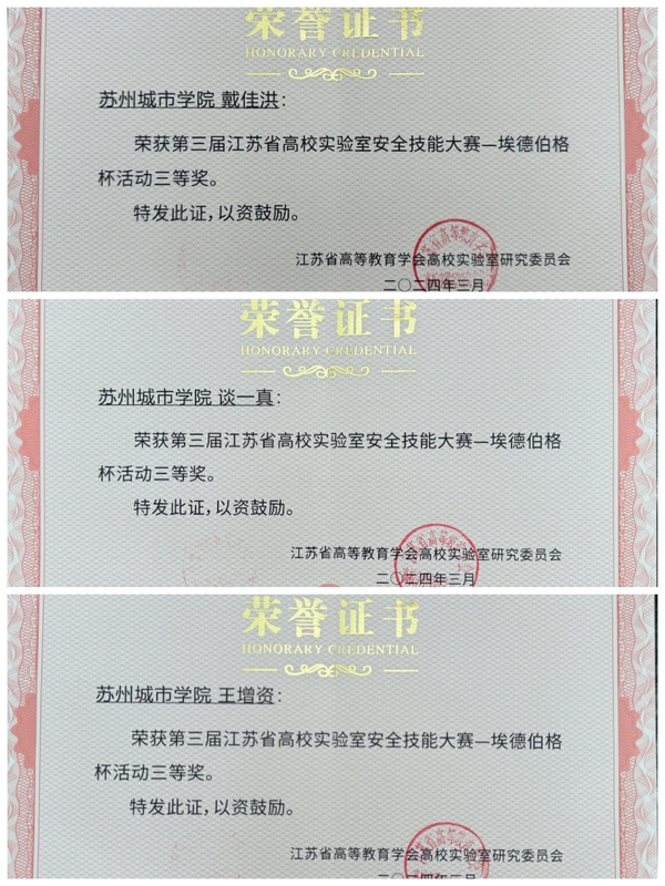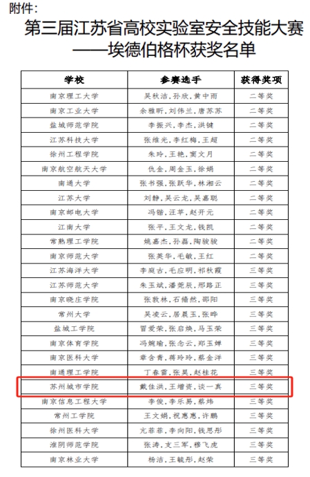 3月17日,第三届江苏省高校实验室安全技能大赛在南京工业大学举行。大赛吸引了省内67所高校参赛,近200名教师展开激烈角逐。我校由谈一真、戴佳洪和王增资三位老师组成代表队参加了本次大赛,并荣获三等奖。