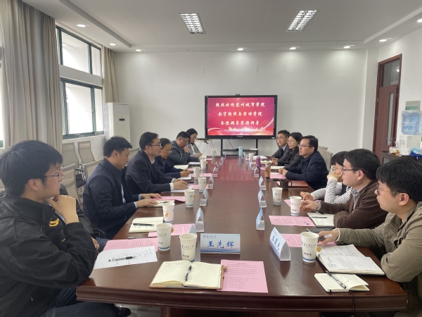 为深入探讨学科发展的新思路和新路径,学习其他院校在专业建设、学科建设、人才培养、师资培养、学科竞赛、产教融合、产学研合作、实验室建设等工作的经验做法,3月25日,数字经济与管理学院党委副书记尹维军带队前往苏州科技大学商学院开展调研学习活动。苏州科技大学商学院副院长(主持工作)杨传明,党委副书记、副院长董现珠,副院长钱燕,各系科主任冯丽艳、郑作龙、张浩博、杨莹,和行政办公室主任王晨光、伍庆参加调研座谈会。我院骨干教师李惠娟、刘嘉毅、潘娟、车继成、曹金飞、尹楠等参加座谈会。