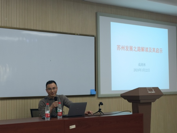 成涛林从苏州市近年来的发展成绩、取得优异成绩的原因、以及发展中面临的风险与机遇等几个方面,详细讲述了坚持对外开发、优化营商环境、发展开发区经济、形成包容文明的社会氛围等措施是苏州取得优异成绩的重要原因。他指出,苏州发展之路既有机遇,也有风险,需要时刻保持清醒,辨别正确方向。作为在苏大学生,要了解苏州,行走苏州,热爱苏州并从苏州发展之路中获得对人生方向的启示。