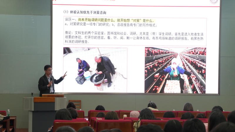 刘向东为学员带来《体验•思考•写作:如何轻松地撰写一份调研报告》的主题分享。刘老师以暑期开展彩礼问题调研为例,从实践调研初心与调研报告定位、调研报告的格式逻辑、调研报告的撰写策略等方面,为学员开展调研、撰写调研报告理清思路。他认为,图书馆和社会是大学生最好的实验室,并建议学员面向时代变革找问题、扎根祖国田野写文章。