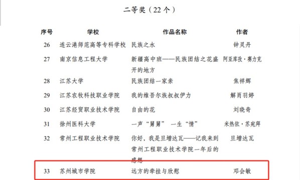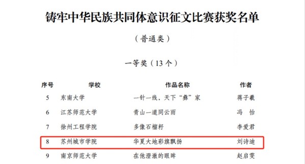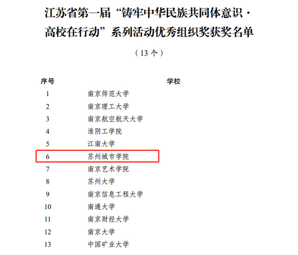 为加强高校铸牢中华民族共同体意识教育,省民宗委、省委宣传部、省委统战部和省教育厅于2023年8月在全省高校组织开展了江苏省第一届“铸牢中华民族共同体意识·高校在行动”系列活动。在校党委的高度重视、有关部门和学院的通力合作以及广大师生的共同努力下,我校积极开展相关活动并踊跃参加各项比赛,共取得一等奖2项、二等奖1项、三等奖1项的好成绩,同时获得优秀组织奖。