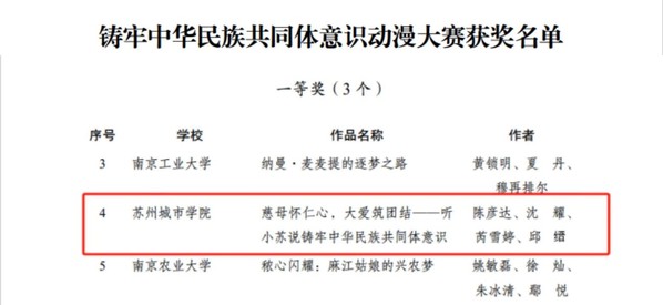 在动漫大赛中,由城市文化与传播学院(作者:陈彦达、沈耀、邱缙)和设计与艺术学院(作者:芮雪婷)共同选送的作品《慈母怀仁心,大爱筑团结——听小苏说铸牢中华民族共同体意识》荣获一等奖,作品以微课堂动画的形式,生动展现各民族手足相亲、守望相助的故事。