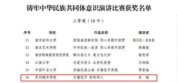 在演讲比赛中,由城市文化与传播学院朱琳老师主讲、马克思主义学院李宏刚老师撰稿的作品《石榴花开 籽籽同心》荣获三等奖,作品围绕民族团结主题,引导各族青年大学生为铸牢中华民族共同体意识增添青春力量。