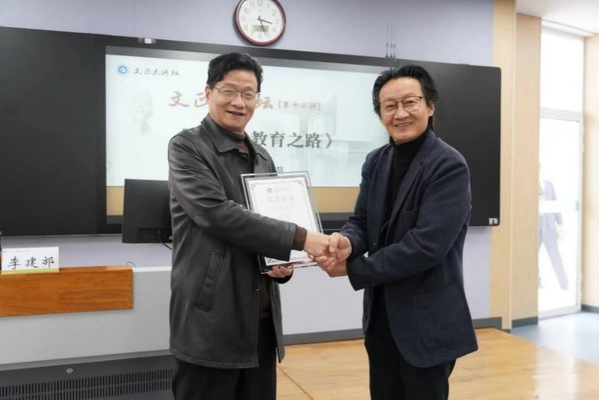 本次讲座特邀全国先进工作者、全国模范教师、全国师德先进个人、江苏省劳动模范、原江苏省木渎高级中学副校长、江苏省中学语文特级教师、江苏省首批教授级中学高级教师、苏州市名教师李建邡老师为大家做题为《四十年教育之路》的讲座。设计与艺术学院师生代表参加本次讲座。讲座由设计与艺术学院党委副书记(主持工作)刘文主持。讲座正式开始前,设计与艺术学院院长姜竹松为李建邡颁发“文正大讲坛”纪念证书。