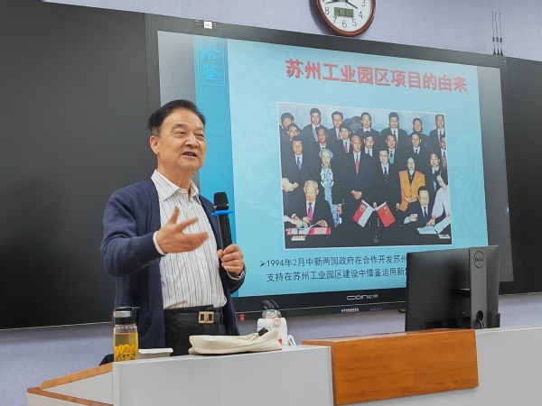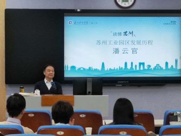 “园区经验”是苏州改革开放中形成的“三大法宝”之一,其“借鉴、创新、圆融、共赢”的精神内核在发展过程中不断丰富,成为苏州人弥足珍贵的精神财富。2024年苏州工业园区迎来开发建设三十周年,为重温园区建设历程上的伟大实践,解读三十年领先的特色经验,4月3日下午,苏州城市学院马克思主义学院特邀原苏州工业园区党工委副书记、园区管委会副主任潘云官作《读懂苏州》第三讲“开放苏州——苏州工业园区发展历程”。
