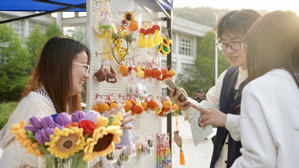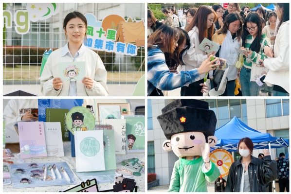 “翠微君”也以不同身份角色融入此次集市。同学们手持“翠微君”簪花打卡图,穿梭在各打卡活动摊位间,为翠微君妆点上了春日的浪漫;“翠微君”AI机器人与同学们开心互动,设立活动当天“智享相册”为同学们提供了一个分享交流与记录美好瞬间的平台;“翠微君”文创展台琳琅满目,展示了“翠微君”IP自2022年6月成立以来打造的各类实体文创。同学们在完成打卡任务后,可兑换相应主题文创,包括“翠微君”春天主题贴纸、“拥抱春天”文化衫等。