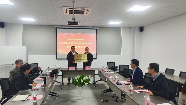 交流会结束后双方共同为“就业实践基地、协同创新中心”揭牌。此次交流会的成功举办,不仅为苏州城市学院和苏州华电搭建了一个良好的合作平台,也为推动产教融合、协同创新提供了有益的借鉴和启示。未来,双方将继续保持密切沟通,共同推动合作项目的落地实施,为培养更多优秀人才、推动区域经济发展作出更大的贡献。随着交流的深入和合作的展开,相信苏州城市学院与苏州华电的产教融合、协同创新之路将会越走越宽,为苏州的教育实践和经济社会发展作出更大的贡献。
