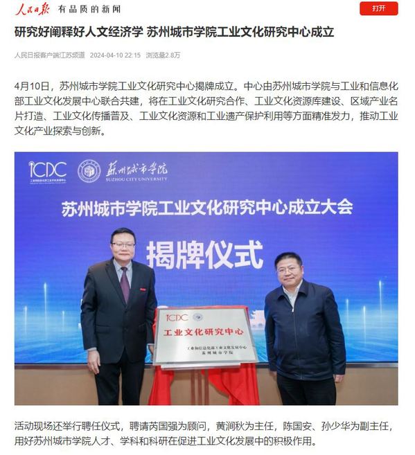 4月10日,苏州城市学院工业文化研究中心揭牌成立。中心由苏州城市学院与工业和信息化部工业文化发展中心联合共建,将在工业文化研究合作、工业文化资源库建设、区域产业名片打造、工业文化传播普及、工业文化资源和工业遗产保护利用等方面精准发力,推动工业文化产业探索与创新。
