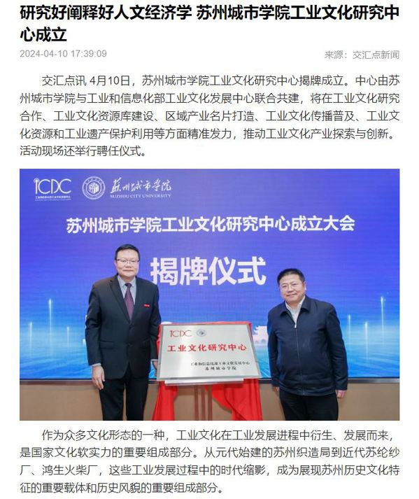 “面对丰富的工业文化资源,高校如何传承好、利用好这些资源,是我们一直在探索的课题。”苏州城市学院党委书记芮国强表示,作为苏州唯一一所市属公办本科高校,城市学院肩负着扎根苏州、研究苏州、服务苏州的重要使命,有义务担起保护工业遗产与传承工业文化之责。中心的成立,便是学校把握新形势下经济高质量发展的客观规律,答好“因地制宜发展新质生产力”时代答卷的有力举措,也是创新合作机制,服务地方经济社会发展的担当作为。