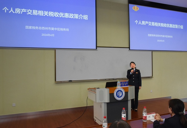 最后,国家税务总局苏州市吴中区税务局法制股副股长、契税部门负责人钱佩英针对教职工关注的个人房产交易相关税收优惠政策也进行深入浅出的解析。通过聚焦房产继承、转移等实际问题,师生们对房产交易相关税收的种类及优惠政策有了更加深刻的理解。