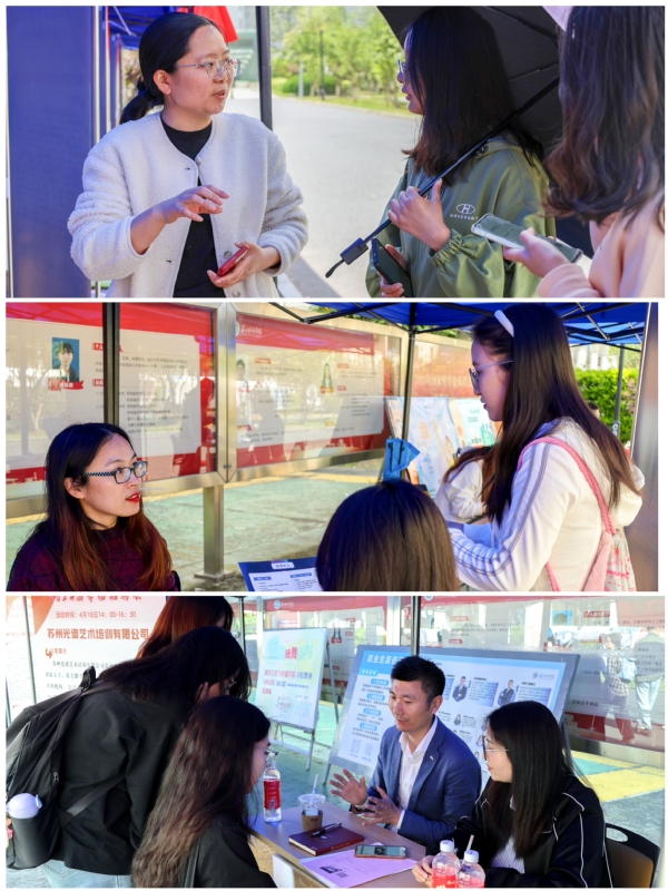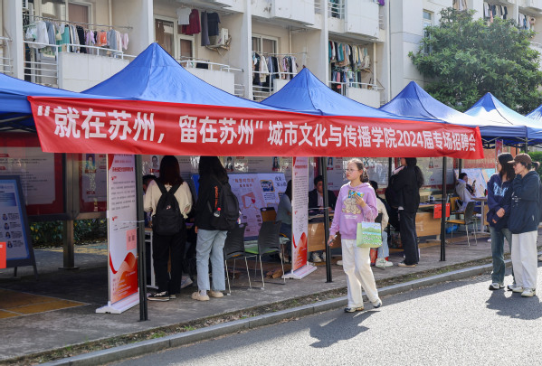 为做好我院2024届毕业生就业工作,4月18日下午,城市文化与传播学院组织的“就在苏州,留在苏州”2024届专场招聘会于一站式学生社区知行社区(第二社区)10号楼前举行。