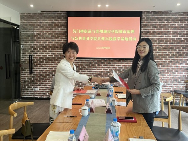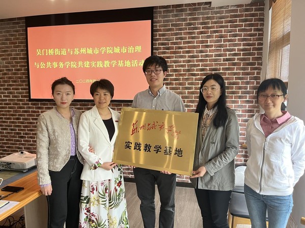 为推进高校与街道联合育人,助力应用型本科高校建设,培养更多高素质应用型本科专业人才,4月22日下午,城市治理与公共事务学院赴苏州市姑苏区人民政府吴门桥街道举行共建实践教学基地签约暨揭牌仪式。姑苏区沧浪新城组织人事局局长丁艳玲、沧浪新城组织人事局副局长陈家骏、沧浪新城党校副校长王玲、南环第二社区党委书记兼居委会主任徐颋玉、城市治理与公共事务学院副院长丁彩霞、人力资源管理教师代表何纯荪和辅导员代表田涣玲共同出席签约授牌仪式。