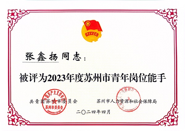 近日,苏州团市委开展了2023年度“苏州市青年岗位能手”申报工作,经逐级选拔、择优推荐、严格审核等环节,我校光学与电子信息学院张鑫扬老师被授予2023年度“苏州市青年岗位能手”荣誉称号。