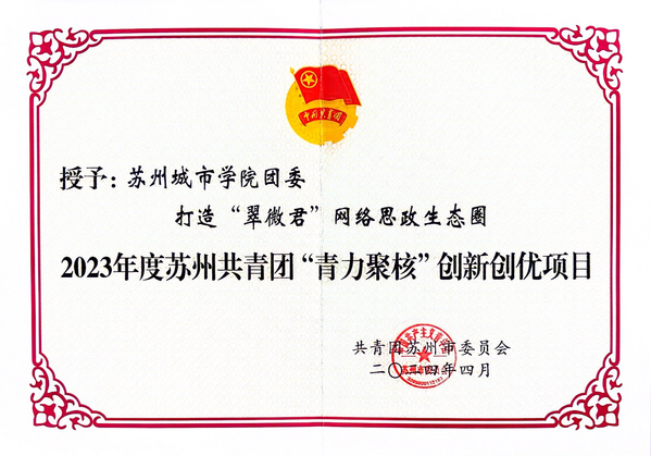 会议通报了2023年度苏州共青团创新创优项目,我校团委《打造“翠微君”网络思政生态圈》荣获了2023年度苏州共青团“青力聚合”创新创优项目。我校作为获奖代表接受表彰。这不仅是对我校共青团工作的肯定,也是对我校在思想政治教育方面所取得成果的认可。