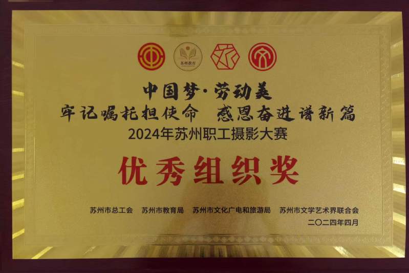 近日,为喜迎新中国成立七十五周年,全面贯彻落实党的二十大精神和中国工会十八大精神,弘扬工人阶级伟大品格和劳模精神、劳动精神、工匠精神,苏州市总工会、苏州市教育局、苏州市文化广电和旅游局、苏州市文学艺术界联合会联合举办了“中国梦·劳动美一牢记嘱托担使命 感恩奋进谱新篇”2024 年苏州职工摄影大赛。我校在本次大赛中荣获优秀组织奖。全市获奖的一共10家单位,其中我校是苏州市教育系统中唯一一家获奖单位。