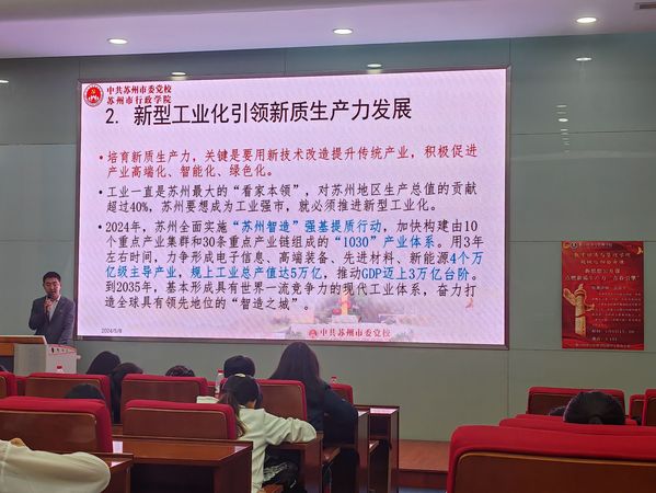 课上,全洛平老师向大家详细阐述了新质生产力的相关内容和涵义。就苏州市因地制宜以“科技创新、新型工业化、新兴服务业”加快引领新质生产力发展展开论述,他指出人才驱动是发展新质生产力的本质要求,而青年人才的培养和使用是人才队伍建设工作的重要组成部分。因此,点燃新质生产力必须夯实青年人才的信念之基,锤炼青年人才的实践本领,提升青年人才的综合素养,打造青年人才发展的良好生态,以青年人才促进新质生产力发展。