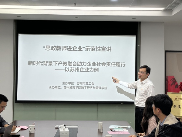 揭牌仪式后,尹维军副书记为参会人员带来了 “劳模工匠进校园 思政教师进企业”暨苏州职工思政教育“百师百课”。尹维军详细介绍了产教融合和企业社会责任履行的相关概念和背景,以及分析苏州地区产教融合助力企业社会责任履行的现状、问题及原因,最后提出针对性的对策和建议。