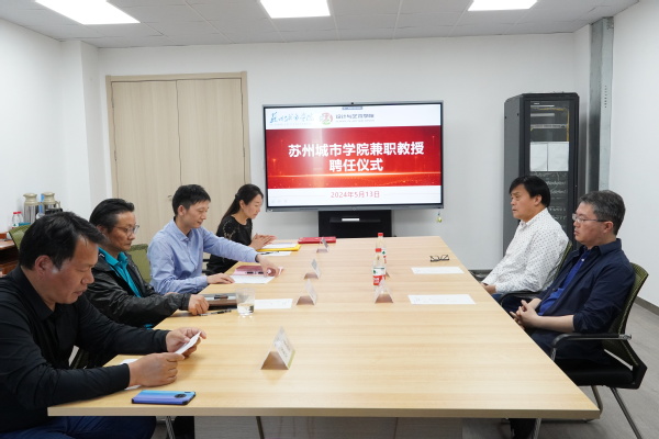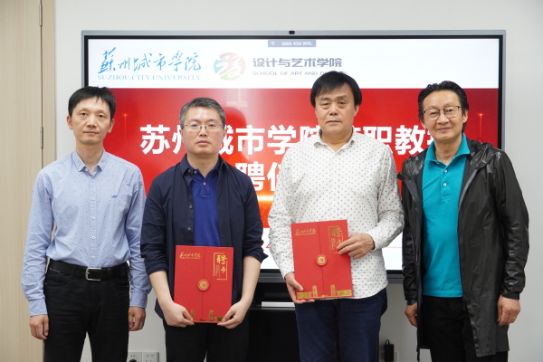 刘文宣读学校聘任决定。姜竹松为苏州大学艺术学院副院长卢朗、苏州科技大学艺术学院原副院长(主持工作)伍立峰颁发兼职教授聘书。