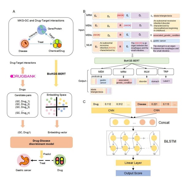 针对上述关键科学问题,杨洋团队提出以计算方法构建知识图谱来存储和融合多源的医学信息,以更加直观的方式展示多种医学实体间的关系,并以此作为基础进一步实现药物再发现。为此,他们设计了一种基于硬参数共享的多任务学习框架,从文献中自动提取与胃癌相关的生物医学知识。其构成的关于胃癌的知识图谱(MKG-GC)包含有8种实体和五种关系类别,总共9129个实体和88482个三元组。为验证其知识图谱的有效性,使用基于CNN-BiLSTM的药物判别模型来预测潜在的胃癌药物,前十种预测药物中有九种此前已被报道对胃癌治疗有效。