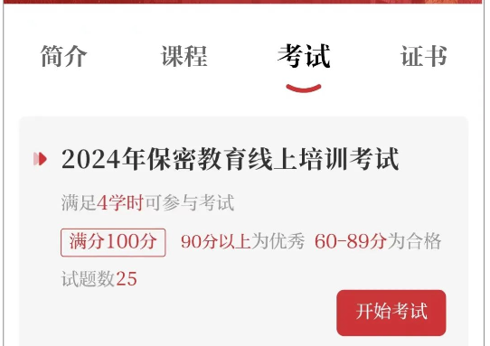 (三)考试。学完4学时后,点击“考试”—“开始考试”。考试时间30分钟,共25道题,其中单选20道,判断5道。考试成绩满分100分,优秀90分,合格60分。