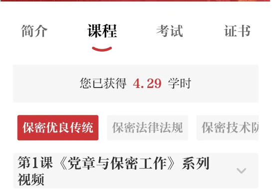 (二)学习。进入系统,点击“课程”开始学习。课程内容包含保密优良传统、保密法律法规、保密技术防范和保密警示案例4部分,以视频、音频为主。其中,标注“必修”字样的课程,是必须学习的内容。