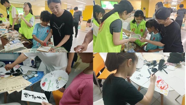 活动现场共设置三个体验区,在造纸术体验区,志愿者们耐心地向市民朋友们宣传造纸的工艺流程,并示范如何利用简易的材料制作纸张。在书法创作区,志愿者们准备了笔墨纸砚,邀请市民朋友们共同挥毫泼墨,书写心中美好的祝福,感受书法的魅力。在团扇制作区,市民们可以选择合适的色彩、笔墨,在志愿者的指导下,创作出独一无二的团扇艺术品。