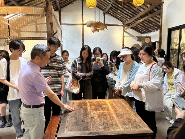 其中,学员们重点参观了诗酒田园文化馆和吴门扇艺传习所,体验古法制香、古琴制作、榫卯、酿酒等古代工艺技艺。此外,馆内众多精美的文创设计作品吸引了同学们驻足观赏。吴中区政协委员王俊清介绍,这些文创产品是多位艺术家的创作成果,他们巧妙地将乡村元素与现代设计相融合,推出了一系列独具特色的文创作品。