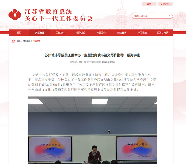 为进一步做好学校关工委主题教育读书征文培育工作,提升学生征文写作能力与水平,提高征文质量,学校关心下一代工作委员会联合城市文化与传播学院和马克思主义学院分别于4月29日和5月7日举办了“关工委主题教育读书征文写作指导”系列讲座。讲座分别由城市文化与传播学院教师陈丽军和马克思主义学院副教授邓会敏主讲。