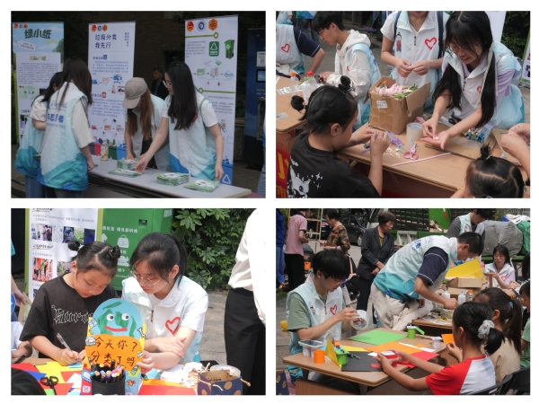 活动现场,志愿者向社区居民科普垃圾分类知识并发放精心制作的垃圾分类宣传手册,帮助他们更加深入地了解垃圾分类方法,进一步增强环保意识;为帮助居民形成垃圾分类习惯,志愿者向他们发放“绿小纸”集章卡,参与捐赠家中废旧物,即可集章并获得社区工作人员准备的扇子和垃圾袋。活动当日正值“六一”儿童节,小朋友们在志愿者的教学引导下,以废旧物为原材料,制作出了富有创意的手工,废旧物重焕新生的同时,绿色环保的理念也在他们的心中生根发芽。