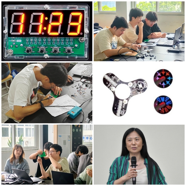 本次大赛初赛以“三叶指尖陀螺”、“多功能数字时钟”为赛题,以小组作品焊接的形式展开。决赛为命题作品设计,着重考查选手电路设计、焊接专业能力,以及创新能力和协作精神。参赛选手需在规定时间内完成电路原理图设计、电路板焊接、产品装配、电路统调,并提交设计书和装配完成的作品。答辩环节,选手们对作品的设计方案、使用器材、工作原理、性能等进行讲解。最终,22书院(工科基地班)李怡帆、22书院(工科基地班)胡璟、22轨道信号杨帅栋小组在决赛的作品设计以及答辩中均表现优异,获得本届大赛一等奖。
