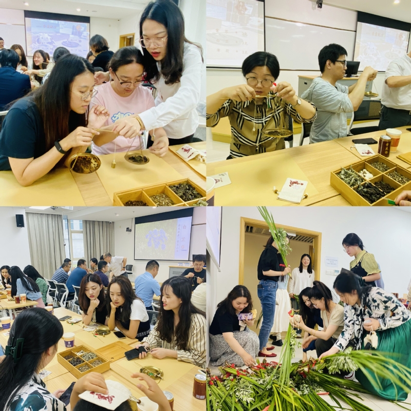 活动现场,如同一个五彩斑斓的画卷,在舌尖、眼前、耳畔和指尖上徐徐展开。崔如愿老师向大家介绍了端午节的由来和文化内涵,让大家更加深入了解了这一传统节日。接着,她为老师们发放了精心准备的中药包,泡制了银杏黄精茶,并现场教授如何通过观察中药的外形和品味其独特的气味来辨认丁香、紫苏、白芷、薄荷、广藿香、艾草这六位药材以及如何正确使用戥称精确计量草药重量。参加活动的老师们跟随崔老师、成老师的指导,亲手制作自己的香囊,并在完成后互相分享展示。